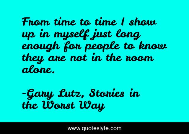This page presents the quote "From time to time I show up in myself just long enough for people to know they are not in the room alone.". Author of this quote is Gary Lutz, Stories in the Worst Way. This quote is about alone, non-existence, humour, unnoticed,.