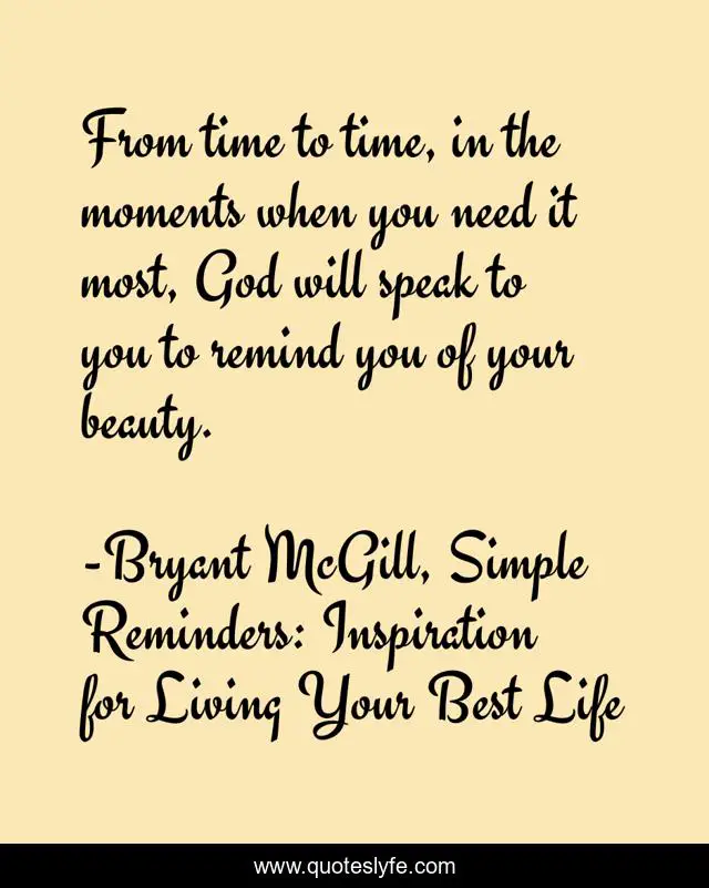 This page presents the quote "From time to time, in the moments when you need it most, God will speak to you to remind you of your beauty.". Author of this quote is Bryant McGill, Simple Reminders: Inspiration for Living Your Best Life. This quote is about moments, god, speaks, beauty, time,.