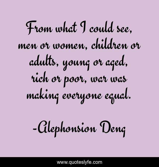 This page presents the quote "From what I could see, men or women, children or adults, young or aged, rich or poor, war was making everyone equal.". Author of this quote is Alephonsion Deng. This quote is about social-class, reality, war, sad,.