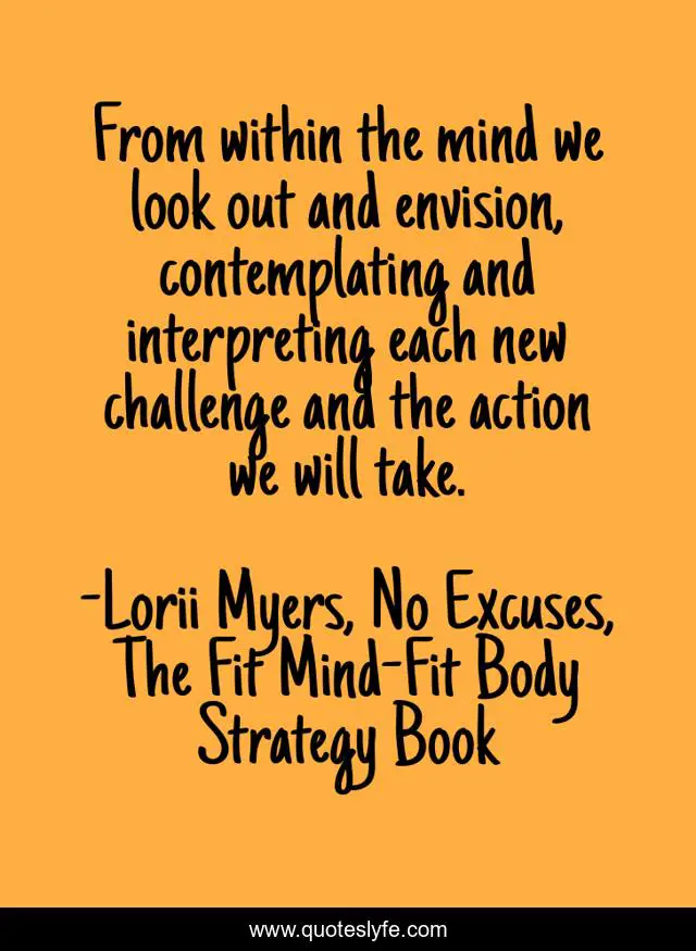 This page presents the quote "From within the mind we look out and envision, contemplating and interpreting each new challenge and the action we will take.". Author of this quote is Lorii Myers, No Excuses, The Fit Mind-Fit Body Strategy Book. This quote is about challenge, no-excuses, interpret, envision,.