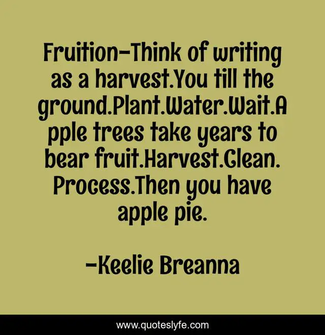 This page presents the quote "Fruition-Think of writing as a harvest.You till the ground.Plant.Water.Wait.Apple trees take years to bear fruit.Harvest.Clean.Process.Then you have apple pie.". Author of this quote is Keelie Breanna. This quote is about writing-process, poetry, writing, poem-apple-pie, writers, writing-poetry, harvest, on-writing,.