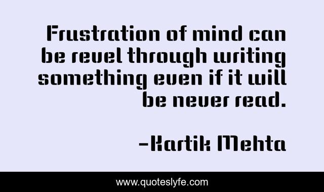 This page presents the quote "Frustration of mind can be revel through writing something even if it will be never read.". Author of this quote is Kartik Mehta. This quote is about frustrated, mind, writing,.