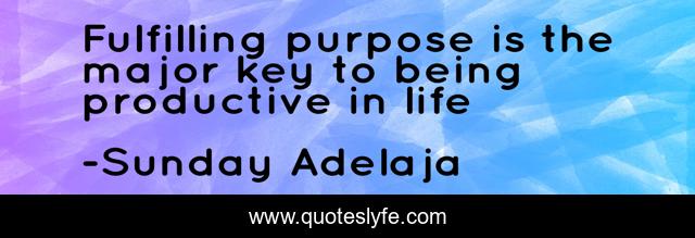 This page presents the quote "Fulfilling purpose is the major key to being productive in life". Author of this quote is Sunday Adelaja. This quote is about love, people, money, principles, employment, worship, productive, productivity, jobless,.
