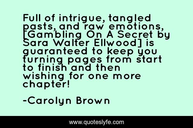 This page presents the quote "Full of intrigue, tangled pasts, and raw emotions, [Gambling On A Secret by Sara Walter Ellwood] is guaranteed to keep you turning pages from start to finish and then wishing for one more chapter!". Author of this quote is Carolyn Brown. This quote is about family-drama, romantic-suspense, contemporary-romance, western,.