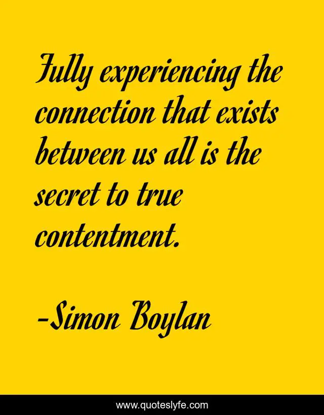 This page presents the quote "Fully experiencing the connection that exists between us all is the secret to true contentment.". Author of this quote is Simon Boylan. This quote is about enthusiasm, connection, inspiration, inspirational, wisdom,.