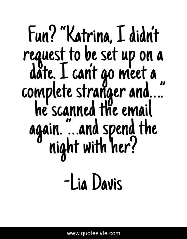 This page presents the quote "Fun? “Katrina, I didn’t request to be set up on a date. I can’t go meet a complete stranger and….” he scanned the email again. “…and spend the night with her?". Author of this quote is Lia Davis. This quote is about one-night-stand, erotic-romance, 1ns, vampire, ravished-before-sunrise,.