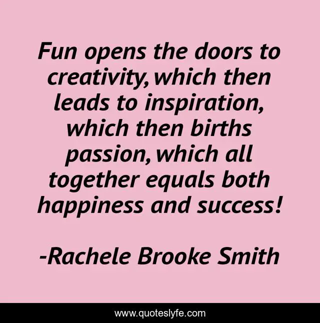 This page presents the quote "Fun opens the doors to creativity, which then leads to inspiration, which then births passion, which all together equals both happiness and success!". Author of this quote is Rachele Brooke Smith. This quote is about creativity, passion, success,.