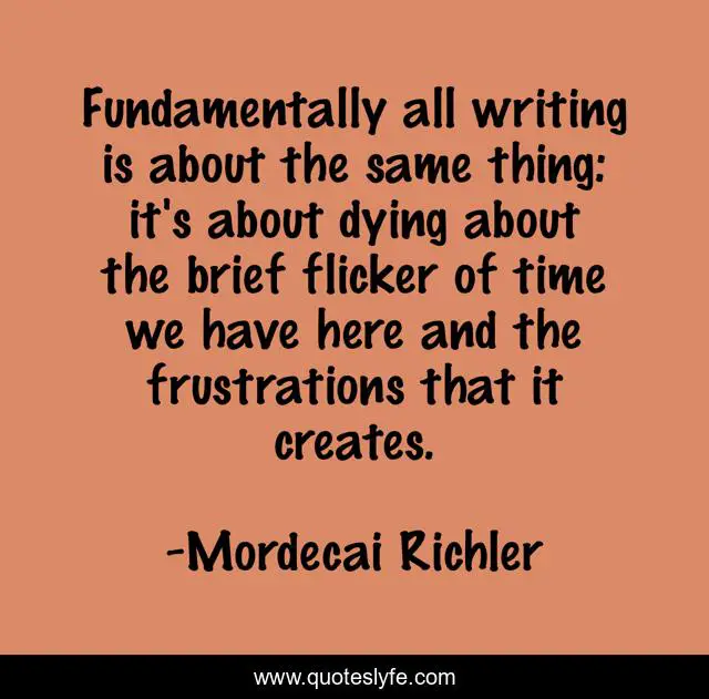This page presents the quote "Fundamentally all writing is about the same thing: it's about dying about the brief flicker of time we have here and the frustrations that it creates.". Author of this quote is Mordecai Richler. This quote is about writers, writing,.