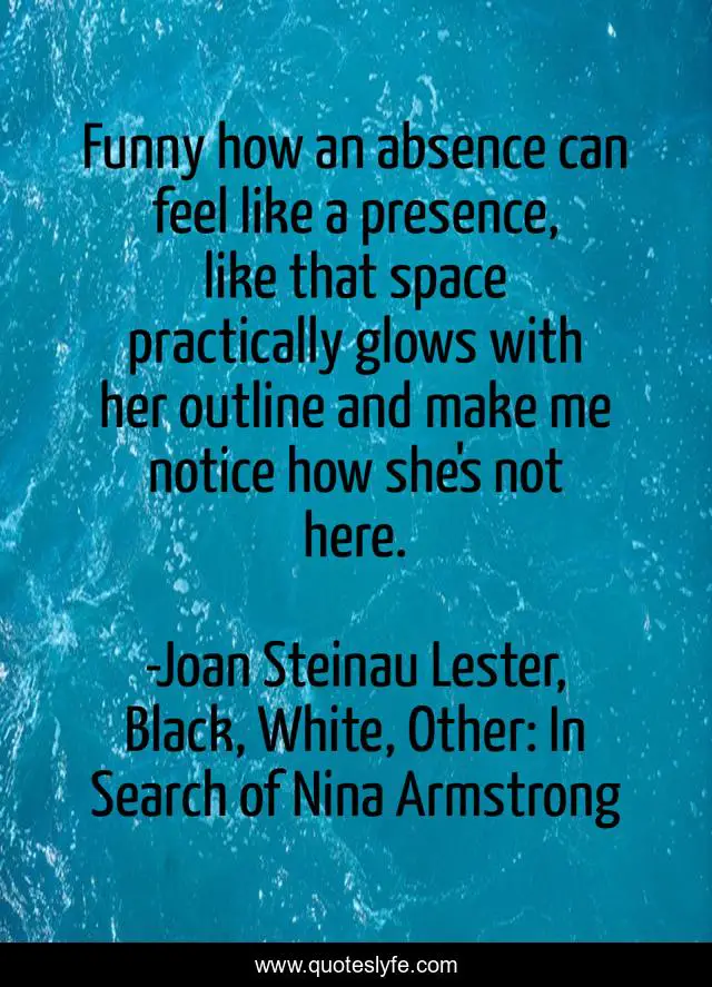 This page presents the quote "Funny how an absence can feel like a presence, like that space practically glows with her outline and make me notice how she's not here.". Author of this quote is Joan Steinau Lester, Black, White, Other: In Search of Nina Armstrong. This quote is about loss, friendships,.