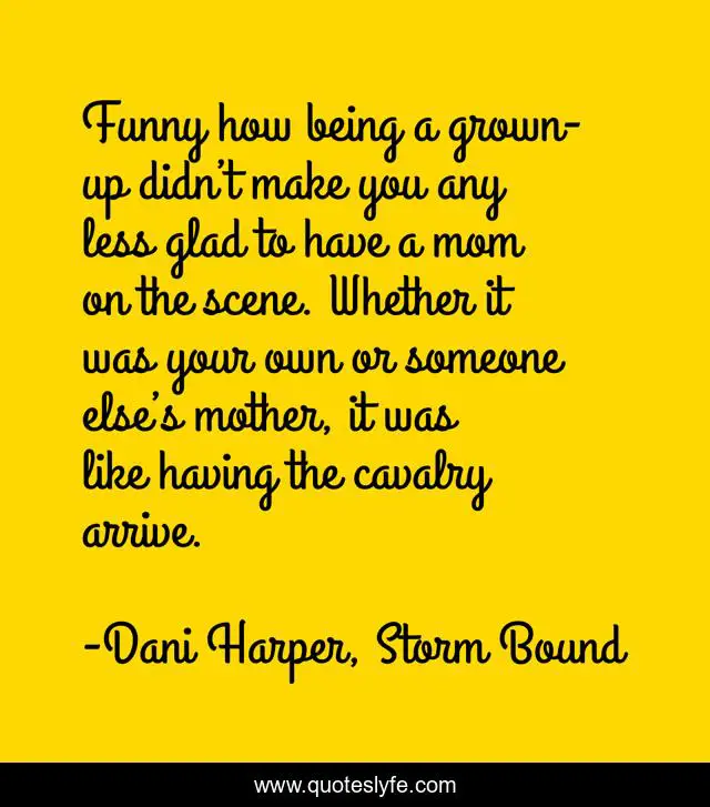 This page presents the quote "Funny how being a grown-up didn’t make you any less glad to have a mom on the scene. Whether it was your own or someone else’s mother, it was like having the cavalry arrive.". Author of this quote is Dani Harper, Storm Bound. This quote is about grim-series, magic, pnr, faery, fantasy, dani-harper,.