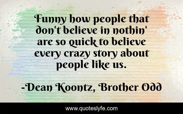 This page presents the quote "Funny how people that don't believe in nothin' are so quick to believe every crazy story about people like us.". Author of this quote is Dean Koontz, Brother Odd. This quote is about brother-knuckles, misguided, beliefs, odd-thomas, faith,.