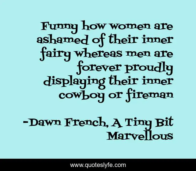 This page presents the quote "Funny how women are ashamed of their inner fairy whereas men are forever proudly displaying their inner cowboy or fireman". Author of this quote is Dawn French, A Tiny Bit Marvellous. This quote is about fairy, fireman, cowboy, men, women,.