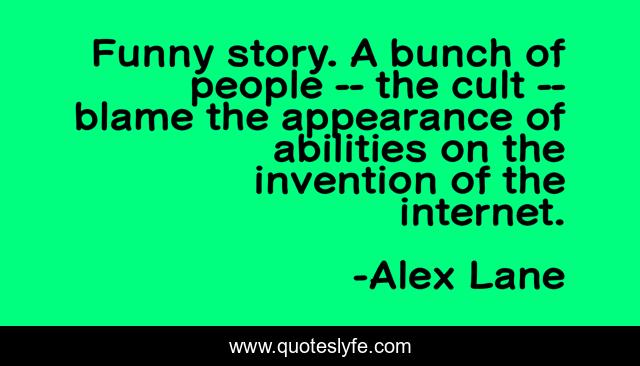 This page presents the quote "Funny story. A bunch of people -- the cult -- blame the appearance of abilities on the invention of the internet.". Author of this quote is Alex Lane. This quote is about ya, superpowers, young-adult, science-fiction, herophobia,.