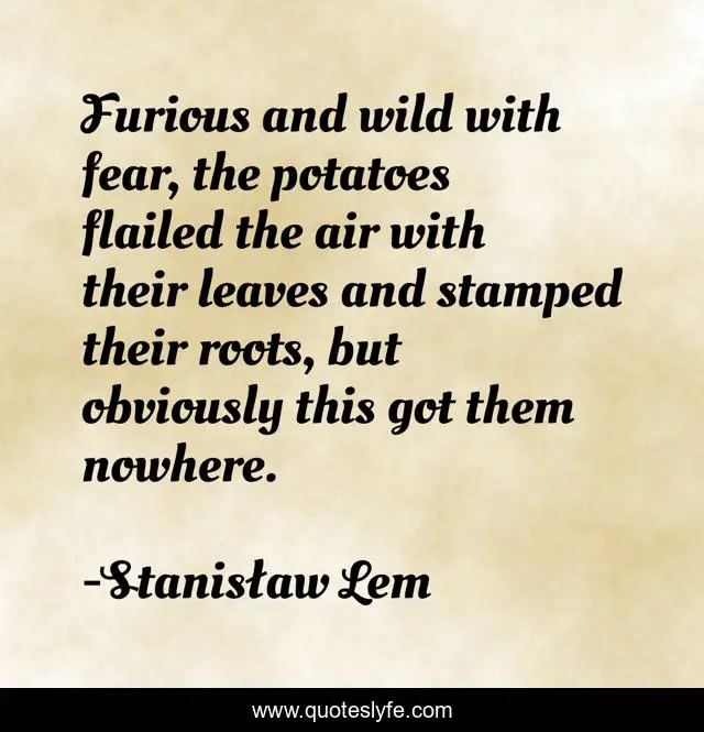 This page presents the quote "Furious and wild with fear, the potatoes flailed the air with their leaves and stamped their roots, but obviously this got them nowhere.". Author of this quote is Stanisław Lem. This quote is about humour, sci-fi, science-fiction,.