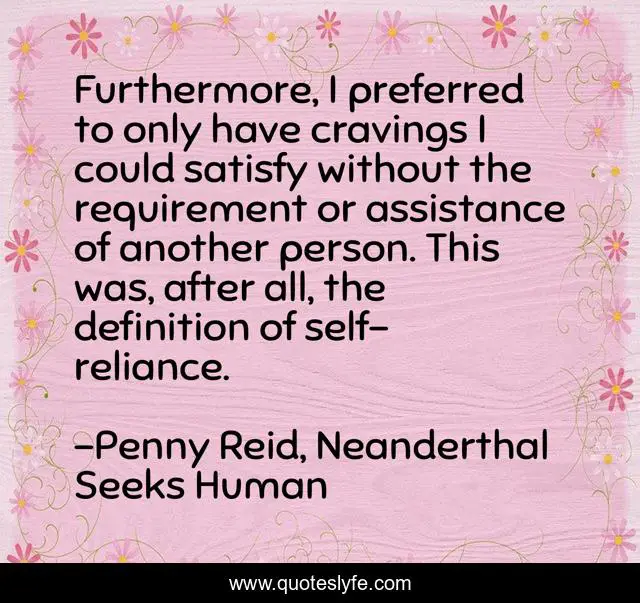 This page presents the quote "Furthermore, I preferred to only have cravings I could satisfy without the requirement or assistance of another person. This was, after all, the definition of self-reliance.". Author of this quote is Penny Reid, Neanderthal Seeks Human. This quote is about romance, love, self-reliance, affection, independence,.