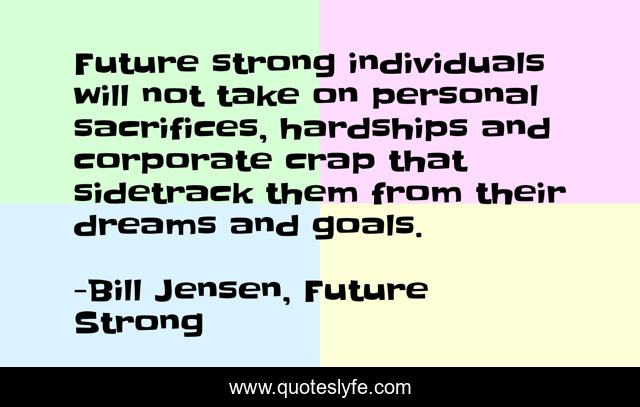 This page presents the quote "Future strong individuals will not take on personal sacrifices, hardships and corporate crap that sidetrack them from their dreams and goals.". Author of this quote is Bill Jensen, Future Strong. This quote is about enthusiasm, future, leadership, inspirational, self-help,.