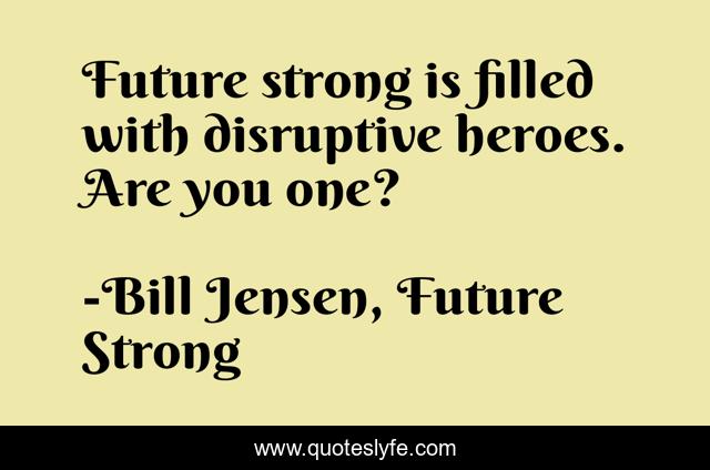 This page presents the quote "Future strong is filled with disruptive heroes. Are you one?". Author of this quote is Bill Jensen, Future Strong. This quote is about enthusiasm, future, leadership, inspirational, self-help,.