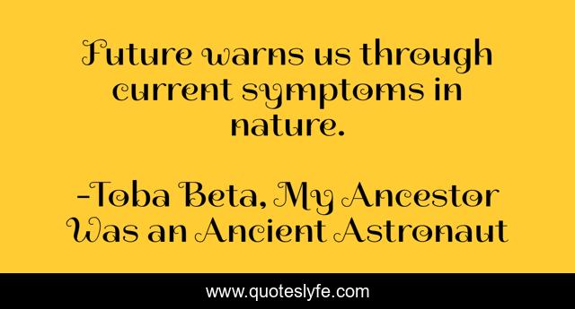 This page presents the quote "Future warns us through current symptoms in nature.". Author of this quote is Toba Beta, My Ancestor Was an Ancient Astronaut. This quote is about symptoms, future, warning, present, nature,.