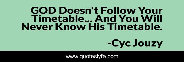 This page presents the quote "GOD Doesn't Follow Your Timetable... And You Will Never Know His Timetable.". Author of this quote is Cyc Jouzy. This quote is about follow, life, christianity, god, jesus,.