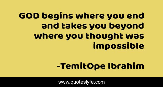 This page presents the quote "GOD begins where you end and takes you beyond where you thought was impossible". Author of this quote is TemitOpe Ibrahim. This quote is about confidence, ibrahim, word, truth, impossible, inspirational, motivational, god-is-beyond, possibility,.