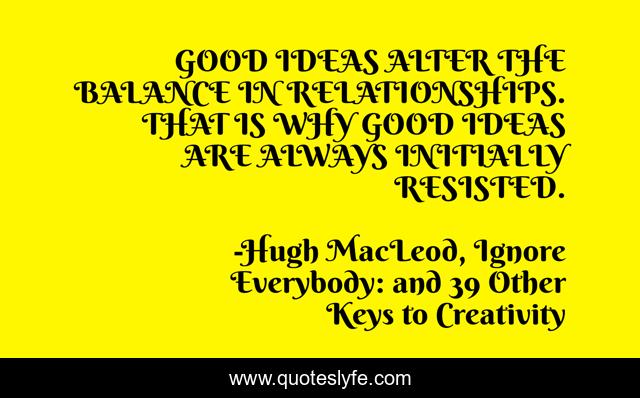This page presents the quote "GOOD IDEAS ALTER THE BALANCE IN RELATIONSHIPS. THAT IS WHY GOOD IDEAS ARE ALWAYS INITIALLY RESISTED.". Author of this quote is Hugh MacLeod, Ignore Everybody: and 39 Other Keys to Creativity. This quote is about creativity, ideas,.