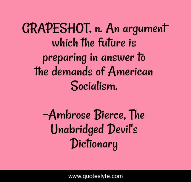 This page presents the quote "GRAPESHOT, n. An argument which the future is preparing in answer to the demands of American Socialism.". Author of this quote is Ambrose Bierce, The Unabridged Devil's Dictionary. This quote is about politics, socialism, humor,.