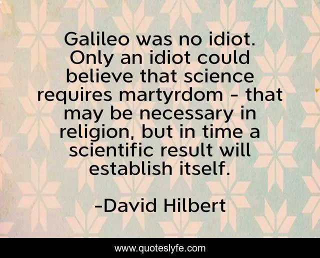 This page presents the quote "Galileo was no idiot. Only an idiot could believe that science requires martyrdom - that may be necessary in religion, but in time a scientific result will establish itself.". Author of this quote is David Hilbert. This quote is about science, believe, time,.