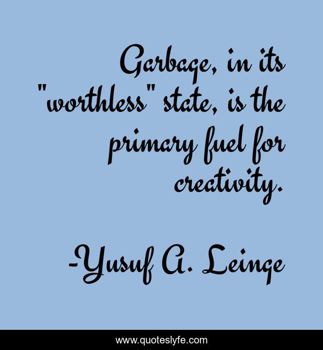 This page presents the quote "Garbage, in its "worthless" state, is the primary fuel for creativity.". Author of this quote is Yusuf A. Leinge. This quote is about creation, garbage, creative,.