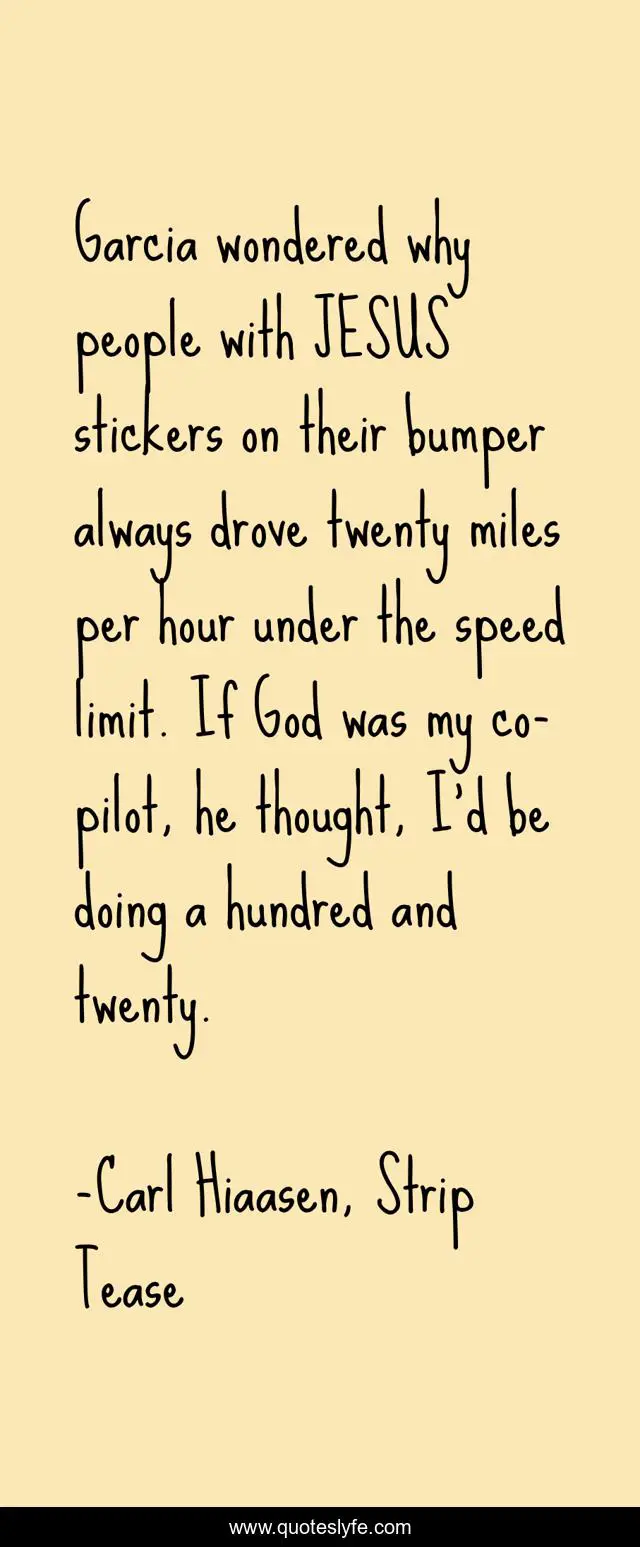"Carl Hiaasen, Strip Tease Quotes." Quoteslyfe.com, 2025. Fri. 05 Dec. 2025. <https://www.quoteslyfe.com/quote/Garcia-wondered-why-people-with-JESUS-stickers-6104>.