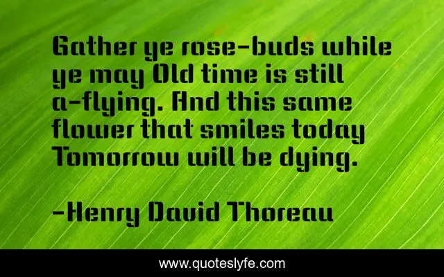This page presents the quote "Gather ye rose-buds while ye may Old time is still a-flying. And this same flower that smiles today Tomorrow will be dying.". Author of this quote is Henry David Thoreau. This quote is about day, one,.