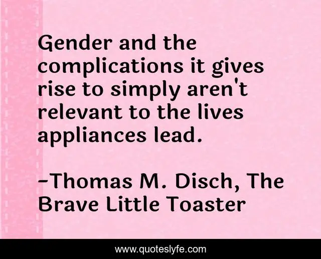 This page presents the quote "Gender and the complications it gives rise to simply aren't relevant to the lives appliances lead.". Author of this quote is Thomas M. Disch, The Brave Little Toaster. This quote is about gender, life, appliances,.