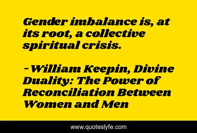 This page presents the quote "Gender imbalance is, at its root, a collective spiritual crisis.". Author of this quote is William Keepin, Divine Duality: The Power of Reconciliation Between Women and Men. This quote is about gender, collective, crisis, spiritual, reconciliation,.