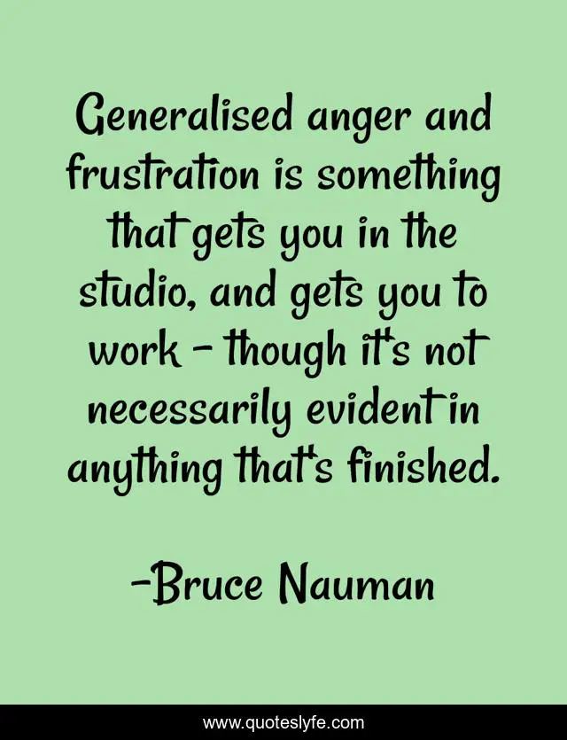 This page presents the quote "Generalised anger and frustration is something that gets you in the studio, and gets you to work - though it's not necessarily evident in anything that's finished.". Author of this quote is Bruce Nauman. This quote is about work, frustration,.