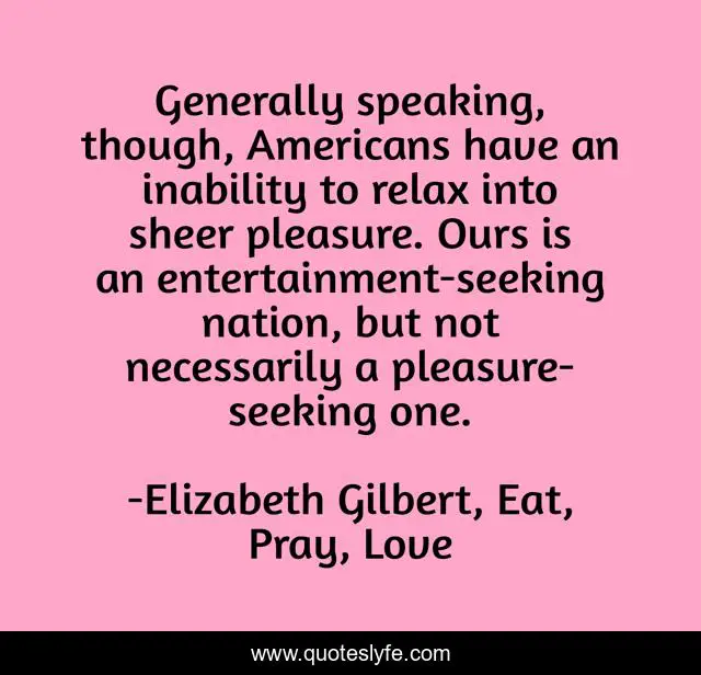 This page presents the quote "Generally speaking, though, Americans have an inability to relax into sheer pleasure. Ours is an entertainment-seeking nation, but not necessarily a pleasure-seeking one.". Author of this quote is Elizabeth Gilbert, Eat, Pray, Love. This quote is about pleasure, americans, relax,.
