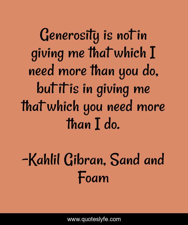 This page presents the quote "Generosity is not in giving me that which I need more than you do, but it is in giving me that which you need more than I do.". Author of this quote is Kahlil Gibran, Sand and Foam. This quote is about giving, generosity,.