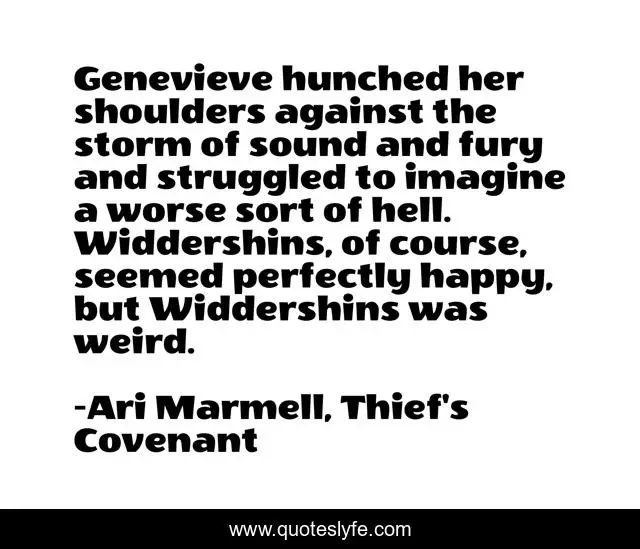 This page presents the quote "Genevieve hunched her shoulders against the storm of sound and fury and struggled to imagine a worse sort of hell. Widdershins, of course, seemed perfectly happy, but Widdershins was weird.". Author of this quote is Ari Marmell, Thief's Covenant. This quote is about friendship, humor,.