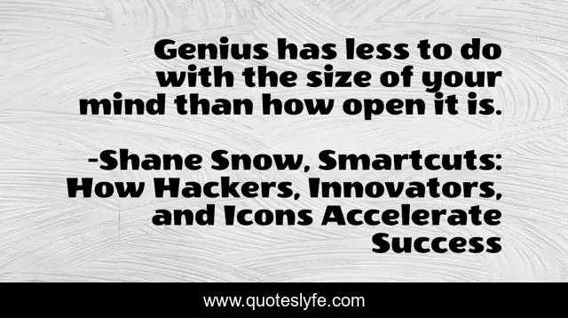 This page presents the quote "Genius has less to do with the size of your mind than how open it is.". Author of this quote is Shane Snow, Smartcuts: How Hackers, Innovators, and Icons Accelerate Success. This quote is about open-mindedness, genius, smartcuts,.