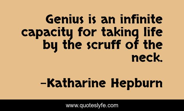 This page presents the quote "Genius is an infinite capacity for taking life by the scruff of the neck.". Author of this quote is Katharine Hepburn. .