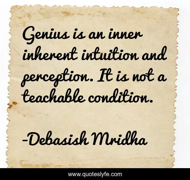 This page presents the quote "Genius is an inner inherent intuition and perception. It is not a teachable condition.". Author of this quote is Debasish Mridha. This quote is about intuition, perception, teachable-condition, genius, philosophy, debasish-mridha, quotes, inspirational, enthusiasm,.