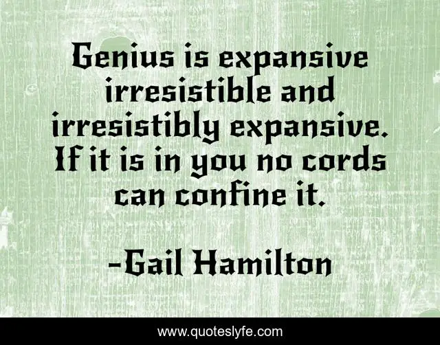 This page presents the quote "Genius is expansive irresistible and irresistibly expansive. If it is in you no cords can confine it.". Author of this quote is Gail Hamilton. This quote is about self, acceptance,.