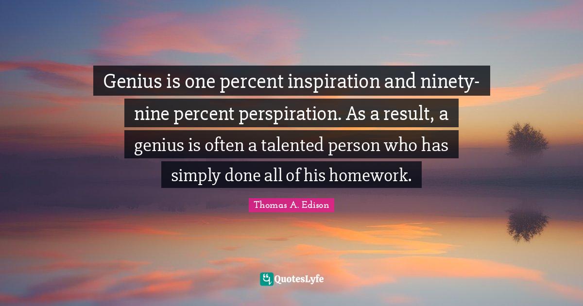 This page presents the quote "Genius is one percent inspiration and ninety-nine percent perspiration. As a result, a genius is often a talented person who has simply done all of his homework.". Author of this quote is Thomas A. Edison. This quote is about genius, talented person, percent, nine, homework, inspirational, ninety nine, ninety, motivational,.
