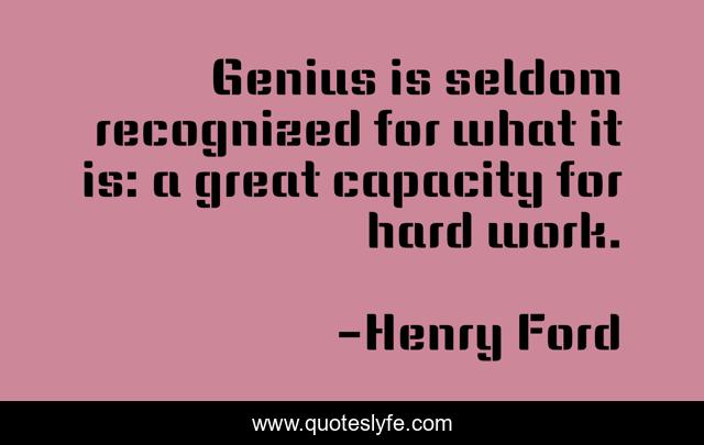 This page presents the quote "Genius is seldom recognized for what it is: a great capacity for hard work.". Author of this quote is Henry Ford. This quote is about inspirational-attitude, inspirational-life,.