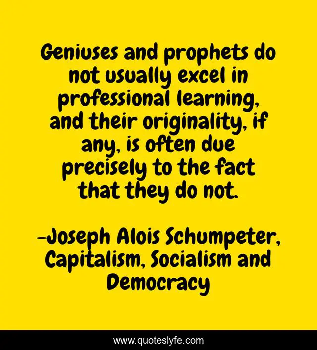 This page presents the quote "Geniuses and prophets do not usually excel in professional learning, and their originality, if any, is often due precisely to the fact that they do not.". Author of this quote is Joseph Alois Schumpeter, Capitalism, Socialism and Democracy. This quote is about economics, intellect,.