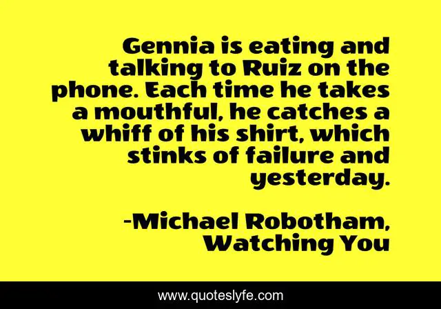 This page presents the quote "Gennia is eating and talking to Ruiz on the phone. Each time he takes a mouthful, he catches a whiff of his shirt, which stinks of failure and yesterday.". Author of this quote is Michael Robotham, Watching You. This quote is about prose, weary,.