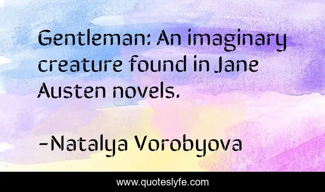 This page presents the quote "Gentleman: An imaginary creature found in Jane Austen novels.". Author of this quote is Natalya Vorobyova. This quote is about novel, chivalry, gentleman, men, jane-austen, tactless, ungentlemanly, politeness, imaginary,.