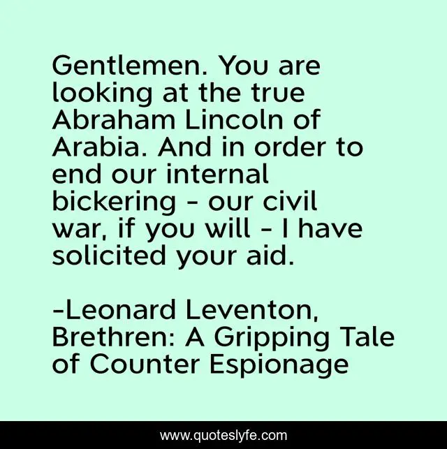 This page presents the quote "Gentlemen. You are looking at the true Abraham Lincoln of Arabia. And in order to end our internal bickering - our civil war, if you will - I have solicited your aid.". Author of this quote is Leonard Leventon, Brethren: A Gripping Tale of Counter Espionage. This quote is about cannes-film-festival, assassination-plot, new-york, baghdad, historical-fiction, cia-ex-kgb, iraq, vietnamese-women, saddam-hussein,.