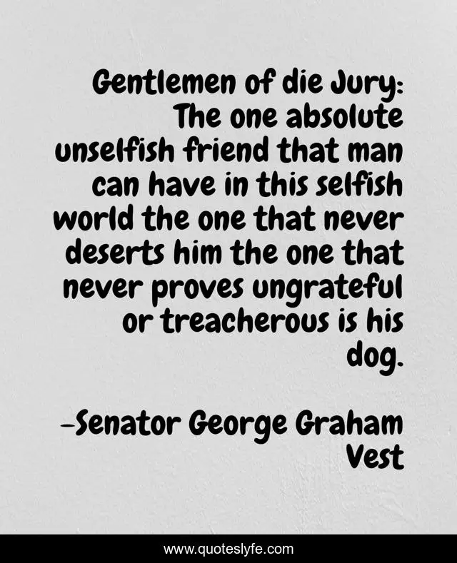 This page presents the quote "Gentlemen of die Jury: The one absolute unselfish friend that man can have in this selfish world the one that never deserts him the one that never proves ungrateful or treacherous is his dog.". Author of this quote is Senator George Graham Vest. .