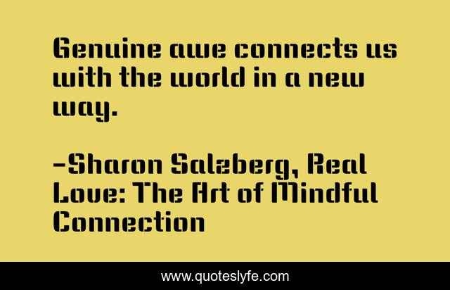 This page presents the quote "Genuine awe connects us with the world in a new way.". Author of this quote is Sharon Salzberg, Real Love: The Art of Mindful Connection. This quote is about love, connection, world, awe, real-love, affection, inspiration,.