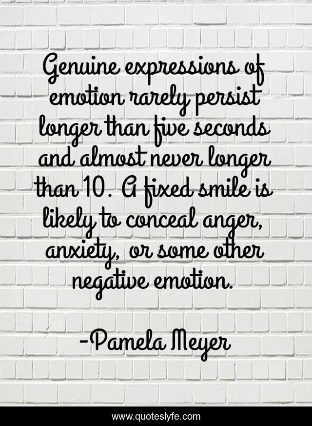 This page presents the quote "Genuine expressions of emotion rarely persist longer than five seconds and almost never longer than 10. A fixed smile is likely to conceal anger, anxiety, or some other negative emotion.". Author of this quote is Pamela Meyer. This quote is about anger, anxiety, negative,.