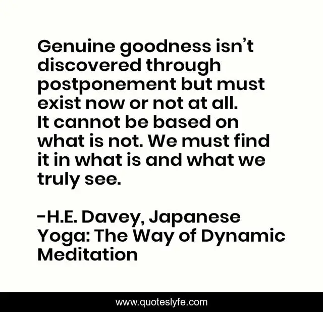 This page presents the quote "Genuine goodness isn’t discovered through postponement but must exist now or not at all. It cannot be based on what is not. We must find it in what is and what we truly see.". Author of this quote is H.E. Davey, Japanese Yoga: The Way of Dynamic Meditation. This quote is about what-is, meditation, now, yoga, goodness,.